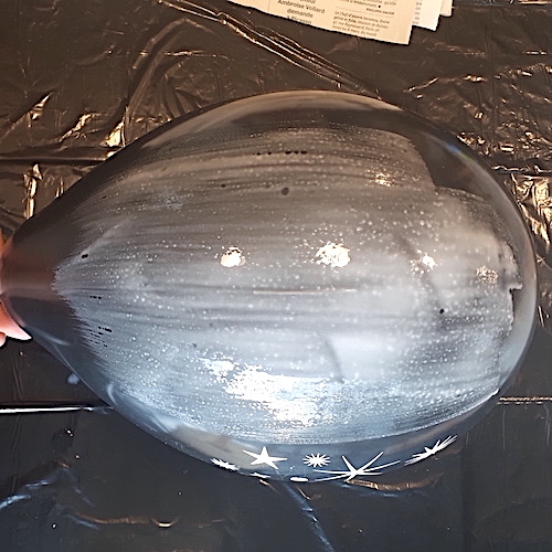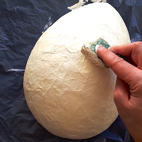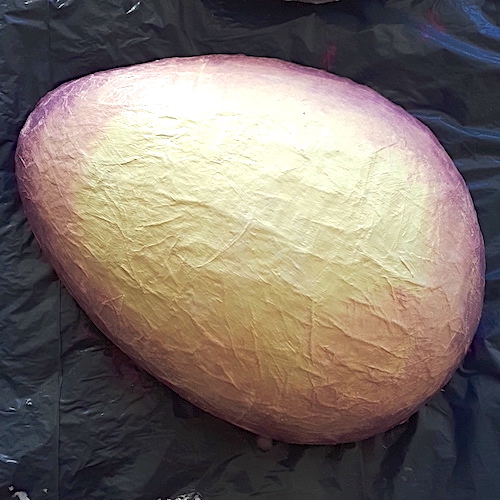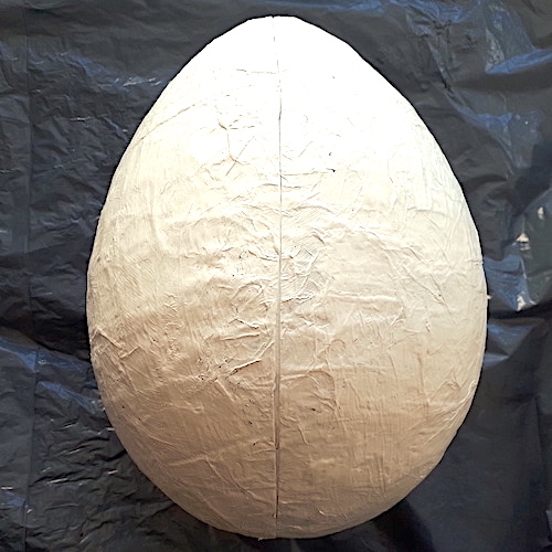 NB: Plus votre œuf sera grand, plus les rebords des deux moitiés d’œuf auront tendance à se déformer (au moment de la peinture par exemple). Pour remédier à cela, vous pouvez gonfler deux autres ballons aux dimensions de votre œuf et les utiliser comme support pour poser vos demi-œufs pendant que la peinture sèche.
