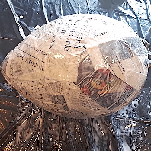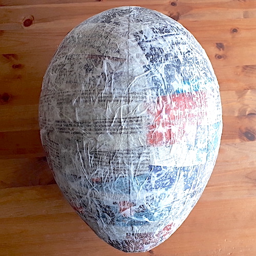 7.Recouvrir le ballon de plusieurs couches supplémentaires de papier journal enduit de colle (faites au minimum quatre couches, vous pouvez aller jusqu’à 8-10 si vous voulez un œuf très solide). Penser à alterner le sens de vos lanières (vertical/horizontal/etc) pour obtenir un oeuf plus solide.