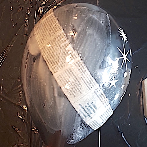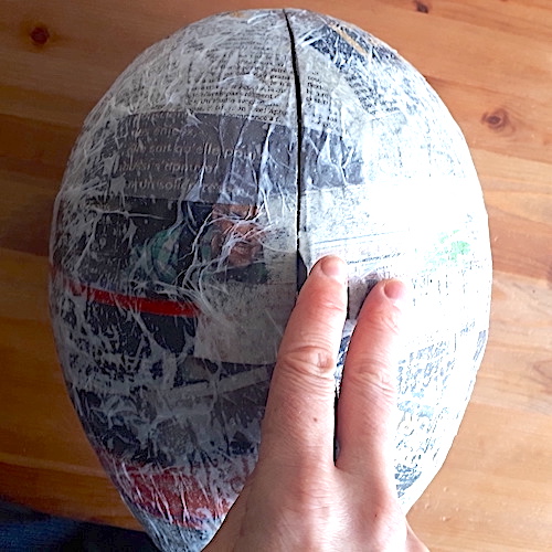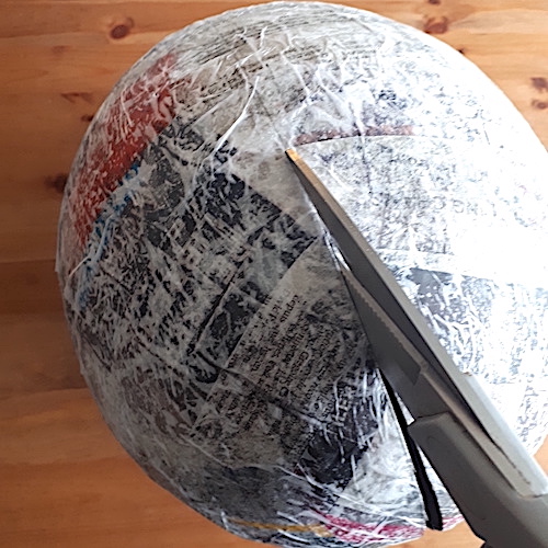 8.Laisser sécher 24-72h (vous pouvez retourner le ballon de temps en temps pour qu’il ne reste pas collé au plan de travail ou au support). Il est primordial que le papier journal soit complètement sec avant de percer le ballon. Si ce n’est pas le cas et que vous percez le ballon de baudruche, le papier maché s’affaissera à l’endroit où il était encore un peu humide! Lorsque vous touchez le ballon, il doit être dur et sonner creux si vous tapez dessus avec vos doigts.