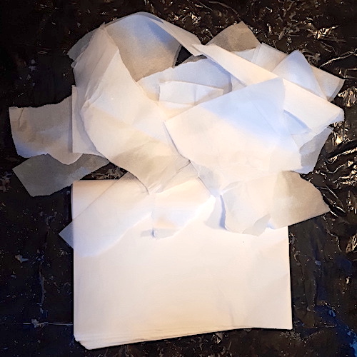 (9a.Si vous avez du papier de soie, vous pouvez le déchirer en morceaux et en recouvrir le ballon durci. Utiliser de la colle blanche (sans la diluer cette fois pour ne pas apporter trop d’humidité au papier mâché). Cette étape n’est pas indispensable mais vous permettra d’avoir moins de plis et donc une couche extérieure plus homogène et plus facile à peindre par la suite).