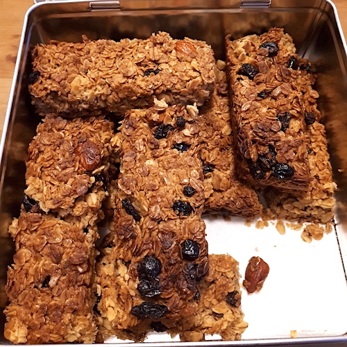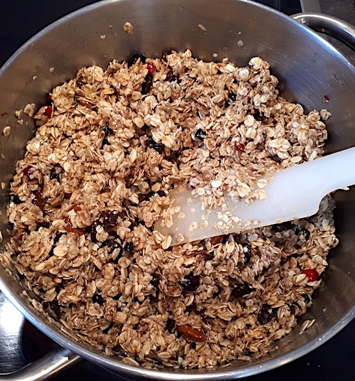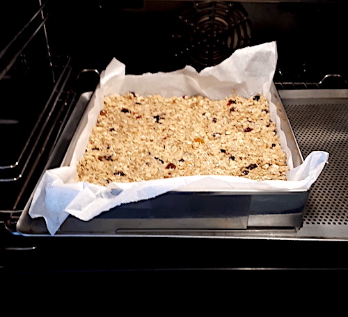 - J’avais essayé, comme je le fait pour toutes mes recettes, de réduire la quantité de miel mais dans le cas des barres de céréales, si on réduit la quantité de miel ou de beurre, les barres ne se tiennent plus du tout…