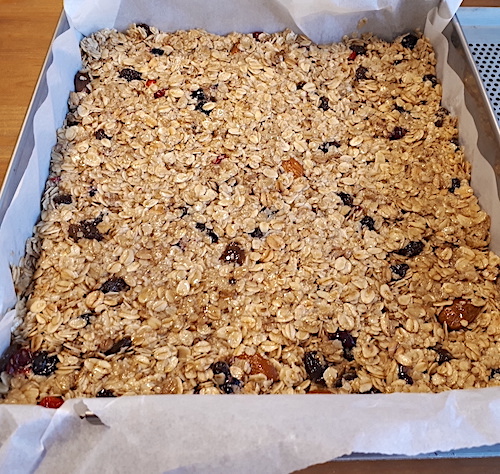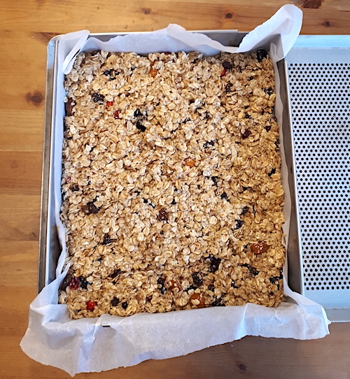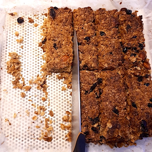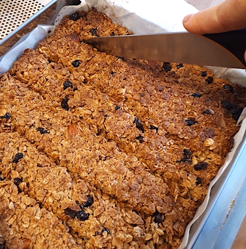 9.Laisser refroidir entièrement avant de repasser sur la première découpe au couteau et de séparer les barres de céréales les unes des autres.