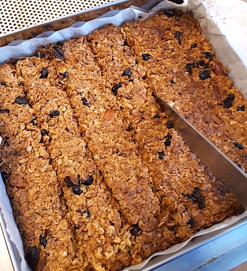 - Il est important de faire la première « découpe » des barres dès qu’elles sortent du four; après, elles durcissent et deviennent très difficiles à couper.