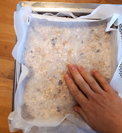 6.Verser dans le cadre sur la plaque et tasser le tout afin d’avoir environ 2 cm d’épaisseur. J’utilise une deuxième feuille de papier cuisson que je pose dessus pour pouvoir tasser plus facilement à la main sans que le mélange ne colle.