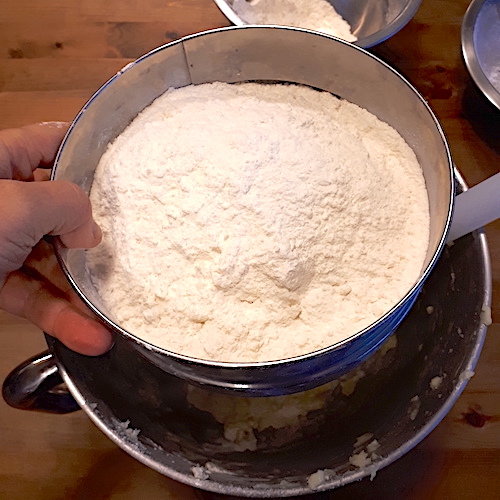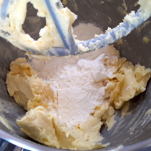 4.Ajouter la farine tamisée en deux ou trois fois, toujours en battant la pâte au robot.