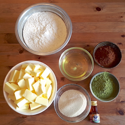 Cette deuxième recette se décline en trois saveurs. Vous pouvez ainsi utiliser une même base de pâte, la diviser en trois et ajouter dans chacune le cacao, thé ou farine (et vanille). De quoi remplir une boite gourmande aux goûts et couleurs variées!