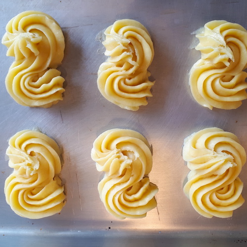 8.Sur une plaque propre, pocher les sablés de façon régulière. Vous pouvez les faire en forme de « S », droits, en zigzag,…