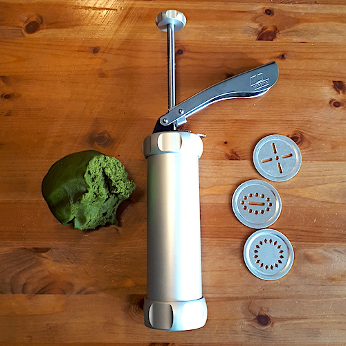 8.Prélever une partie de la pâte et en remplir le piston. Visser l’embout. Commencer à presser les biscuits directement sur une plaque allant au four (chaque piston étant légèrement différent, suivez le mode d’emploi fourni avec le vôtre). Continuer ainsi jusqu’à avoir utilisé toute la pâte. Pour réaliser différentes formes de biscuits, il suffit de changer l’embout à chaque fois que vous remplissez le piston.