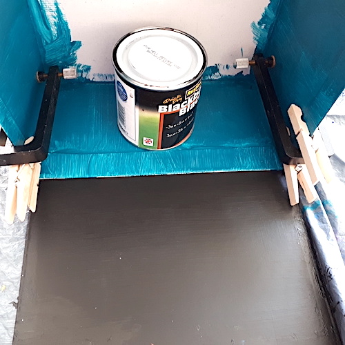 10.Toujours avec la peinture noire, peindre uniquement le haut la partie intérieure du couvercle (celle qui dépassera de la boite par la suite) ainsi que la totalité de la partie extérieure.