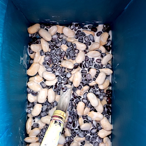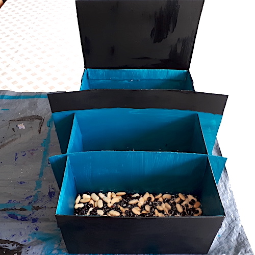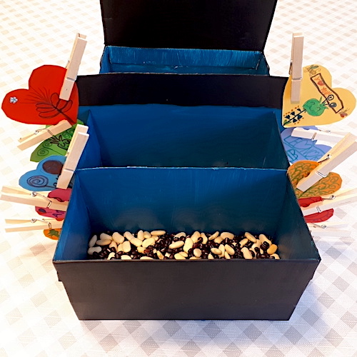 18.Coller les légumineuses dans le fond de chaque compartiment de la boite. Pour cela, j’ai versé un peu de colle blanche liquide dans le fond avant de verser les légumineuses et de secouer un peu la boite pour qu’elle se répartissent de façon homogène. N’hésitez pas à choisir la méthode qui vous convient le mieux.