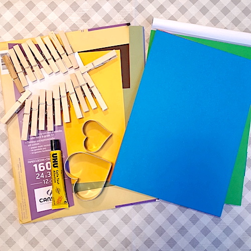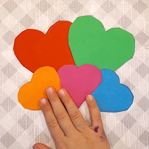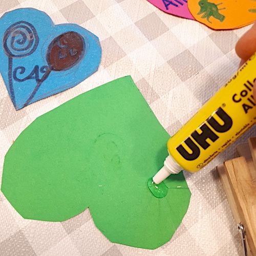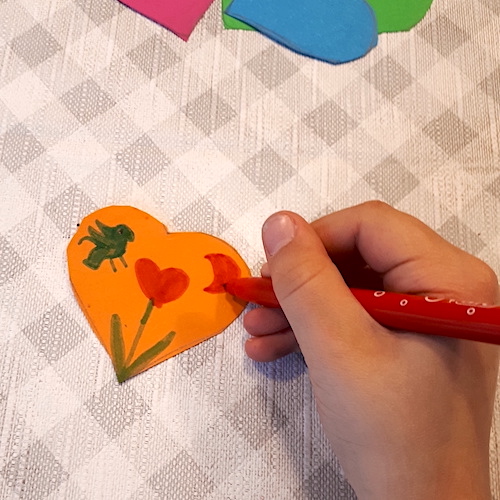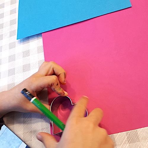 19.Dans les papiers cartonnés de couleur, découper des cœurs (ou d’autres formes). Pour un résultat plus homogène, j’ai proposé aux filles d’utiliser des emporte-pièce comme modèles pour dessiner les cœurs.