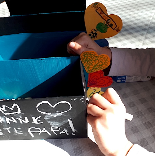 20.Décorer les cœurs puis les coller sur les côtés des rectangles A et B (la partie qui dépasse à l’extérieur du carton).