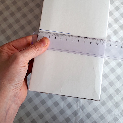 3.Poser la boite à chaussure sur la tranche (long côté). Dessiner un premier trait à 10 cm et un deuxième trait à 20 cm. Les traits commencent du côté ouvert de la boite et descendent jusqu’à la moitié de la hauteur de la boite. Répéter l’opération de l’autre côté.