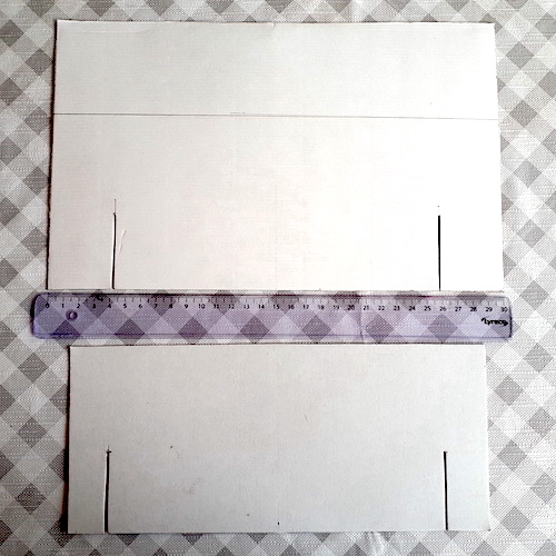 8.Découper quatre encoches à l’emplacement des traits. Ces deux rectangles viendront s’imbriquer dans la boite ; donc, les encoches doivent se trouver sur la partie inférieure des rectangles.