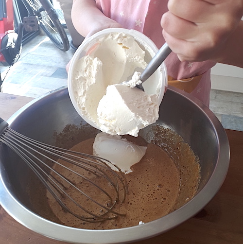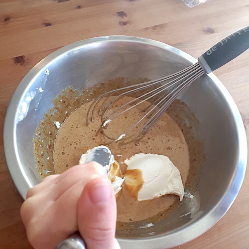 3.Ajouter le mascarpone et bien mélanger à l’aide d’un fouet pour avoir une crème homogène.