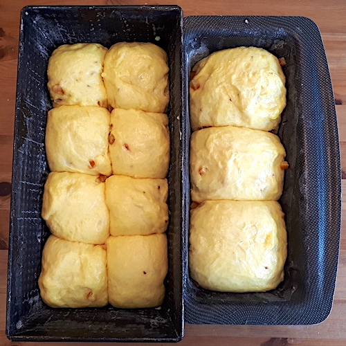 - pour un moule à pain de 30cm: peser 8x100g de pâte et former des boules. Dans le moule beurré et fariné, placer les boules de façon à obtenir à chaque fois deux boules côte à côte en largeur et quatre en longueur.