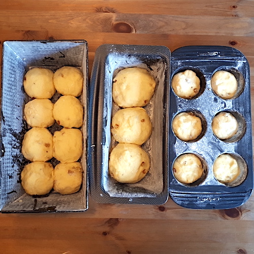 - pour un moule à cake de 26cm: peser 3x200g de pâte et former des boules. Placer les boules côte à côte dans le moule (dans le sens de la longueur) après l’avoir beurré et fariné.