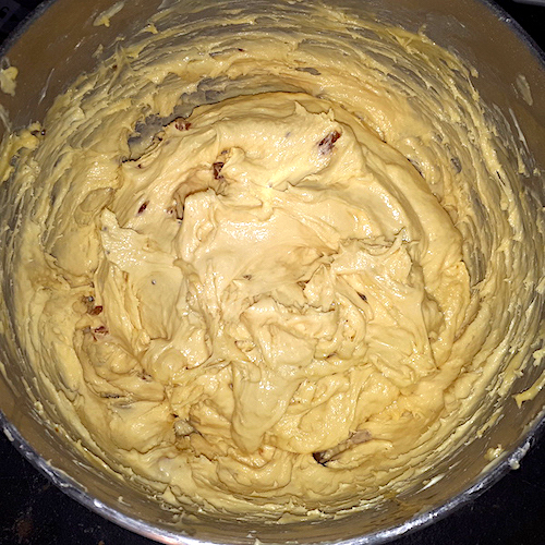 8.Pétrir légèrement la pâte. Celle-ci est très collante, j’utilise donc une corne à pâtisserie pour soulever la pâte par en-dessous et la rabattre sur le dessus (c’est la technique que je trouve la plus pratique).