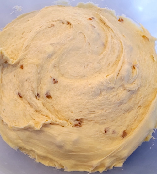 5.En fin de pétrissage, ajouter les morceaux d’écorces d’orange (ou autres) ainsi qu’un peu de rhum ou d’eau de fleur d’oranger pour aromatiser la pâte à brioche (NB : l’alcool s’évaporera durant la cuisson).