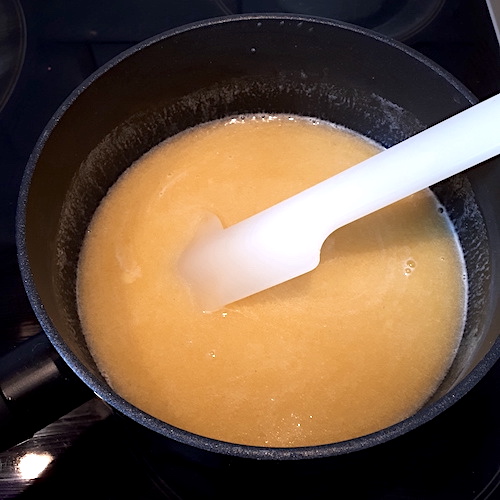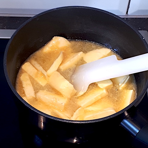 1.Dans une casserole, faire fondre le beurre avec le sucre, l’eau et le sel.