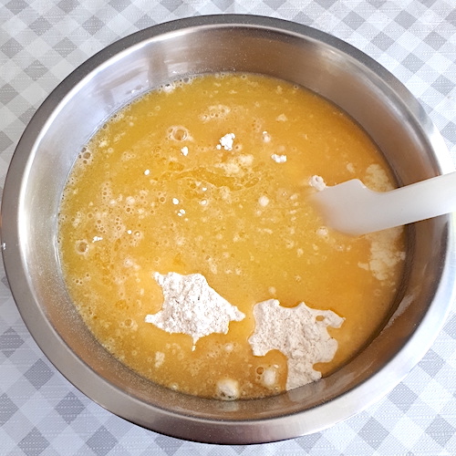 3.Mettre le mélange de beurre fondu refroidi dans un saladier et ajouter la farine et la levure chimique.