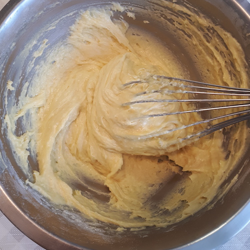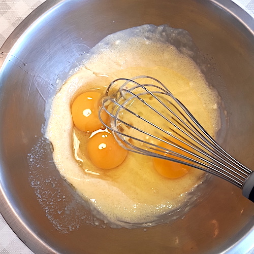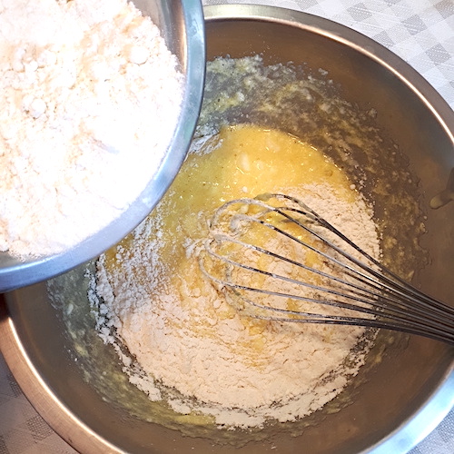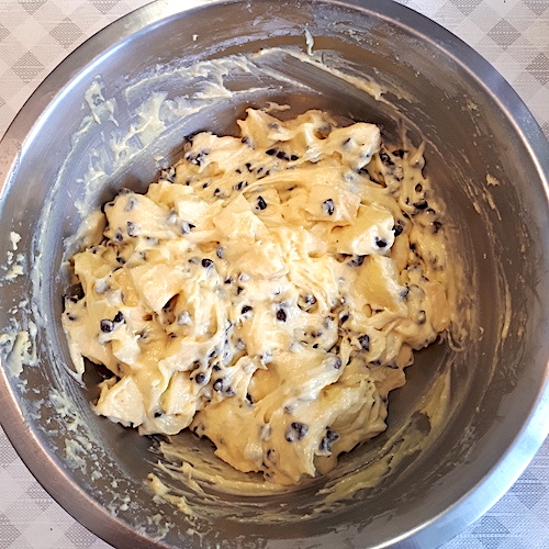 4.Incorporer la farine, la levure, les épices éventuelles, les morceaux de pommes et les pépites de chocolat.