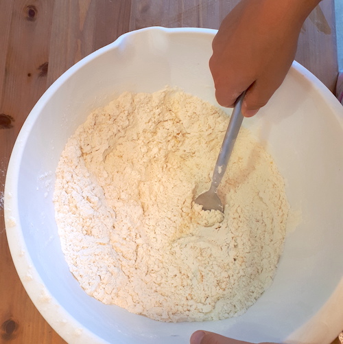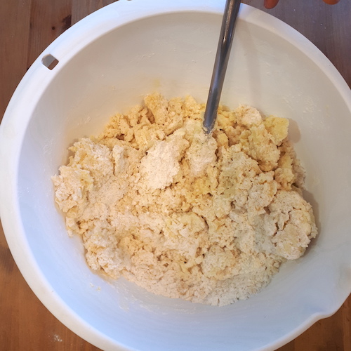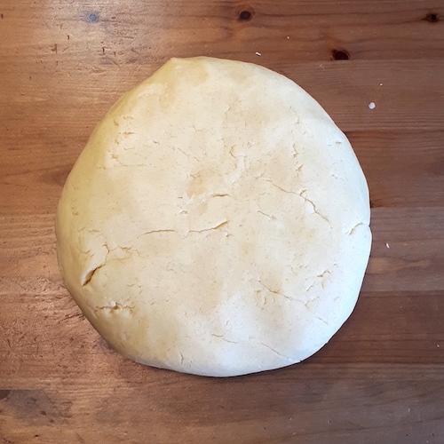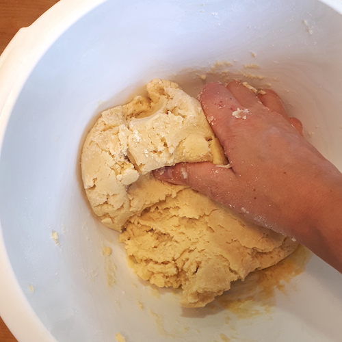 4.Incorporer le beurre et travailler à la main pour former une boule homogène (en ajoutant un peu de farine si la pâte est trop collante).