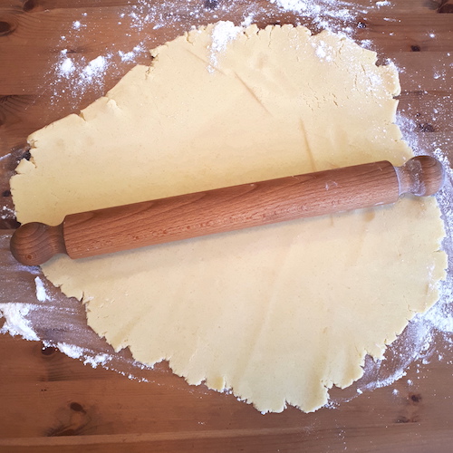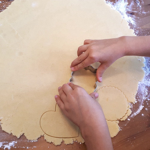 6.Fariner le plan de travail, étaler la pâte assez finement et détailler les sablés à l’emporte-pièce.