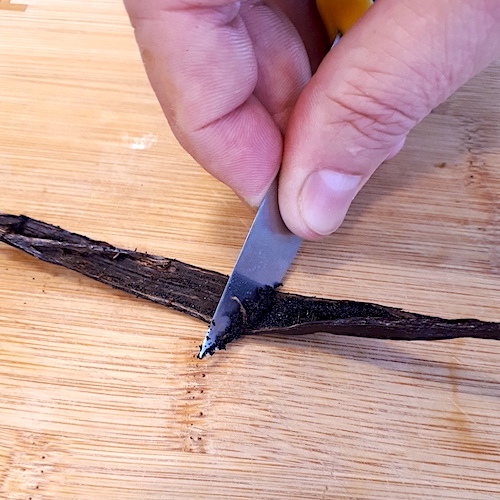 7.Fendre la gousse de vanille en deux (dans le sens de la longueur) et gratter l’intérieur avec un couteau pour en récolter les graines.