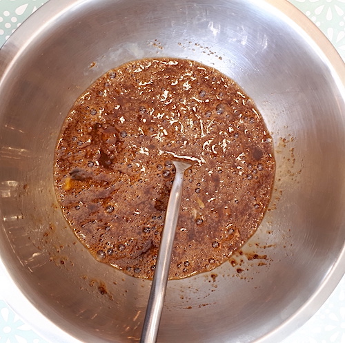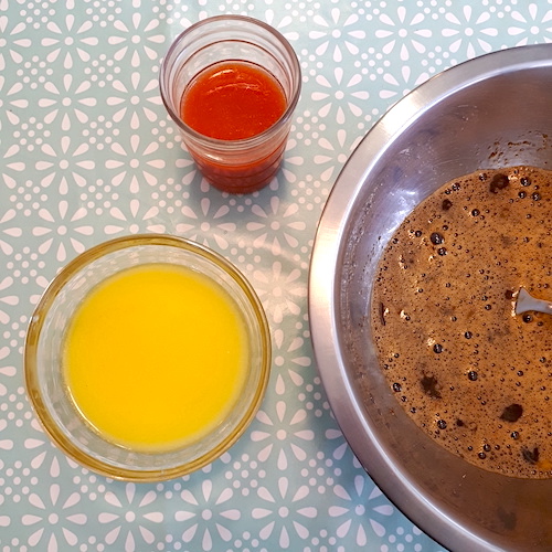 6.Faire fondre les 100g de beurre restant et ajouter au mélange sucre+œufs, ajouter aussi le jus d’orange et bien mélanger.