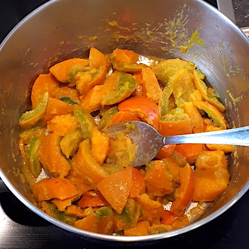 1.Laver le potimarron, le couper en deux, retirer les graines et le détailler en morceaux.