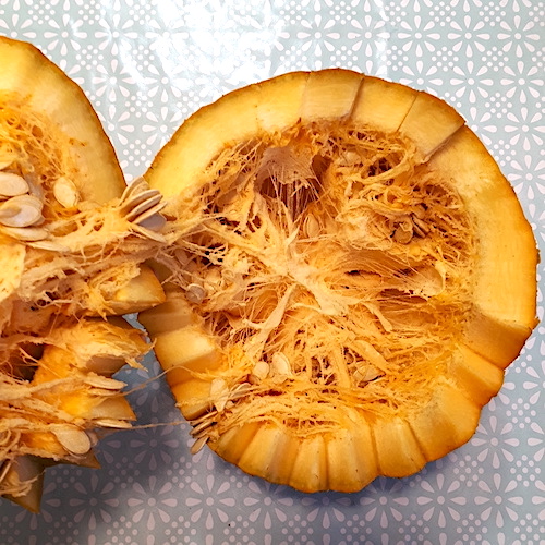 9.Ouvrir la citrouille délicatement en soulevant la partie supérieure. Enlever les graines dans les deux parties de citrouille à l’aide de votre cuillère.