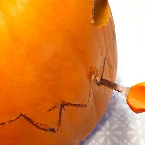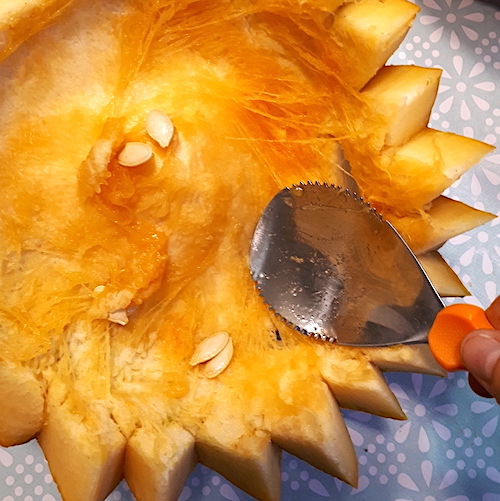 NB: si vous avez un kit d’ustensiles pour citrouille n’hésitez pas à l’utiliser à la place de la cuillère et de certains couteaux!