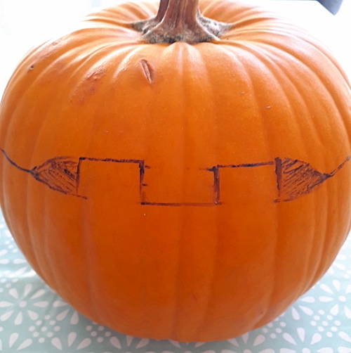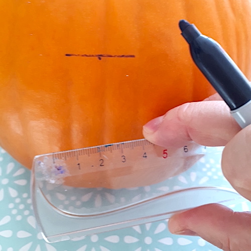 1.Sur la partie arrière de votre citrouille, à environ 2/3 de hauteur en partant du bas, dessiner les charnières à l’aide de votre marqueur (vous pouvez utiliser une règle mais ce n’est pas indispensable).