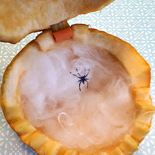 20.Votre citrouille porte-friandises est terminée! Vous pouvez y mettre l’une ou l’autre fausse toile d’araignée avant de la garnir!