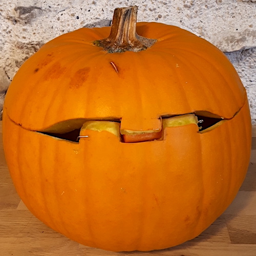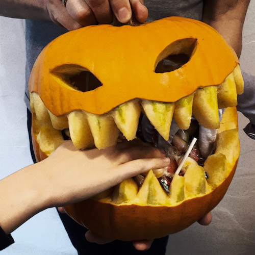 L’idée est de créer une sorte de boite dont le haut s’ouvre et se ferme à l’aide de charnières découpées directement dans la partie arrière de la citrouille (voir photos). Les enfants devront glisser leur main entre les dents pointues qui garnissent les mâchoires de la citrouille…