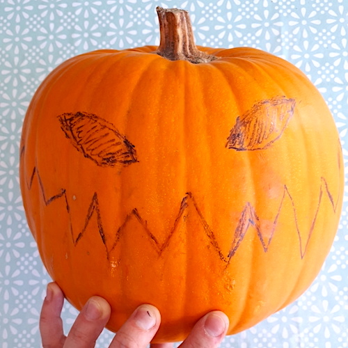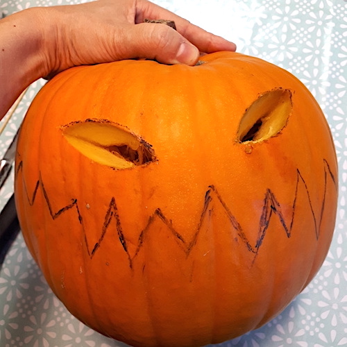 4.Toujours sur la partie avant de la citrouille, dessiner des yeux au-dessus des dents.