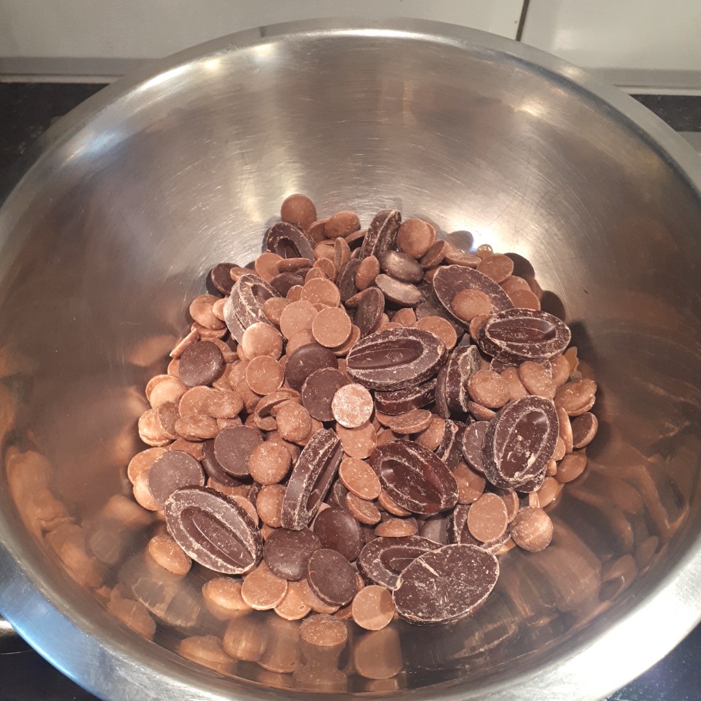 - 350g chocolat noir (+- 60% de cacao) coupé en morceaux (ou pistoles)