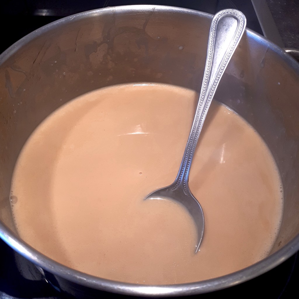 4.Hors du feu, verser la crème sur le caramel (attention aux éclaboussures !).