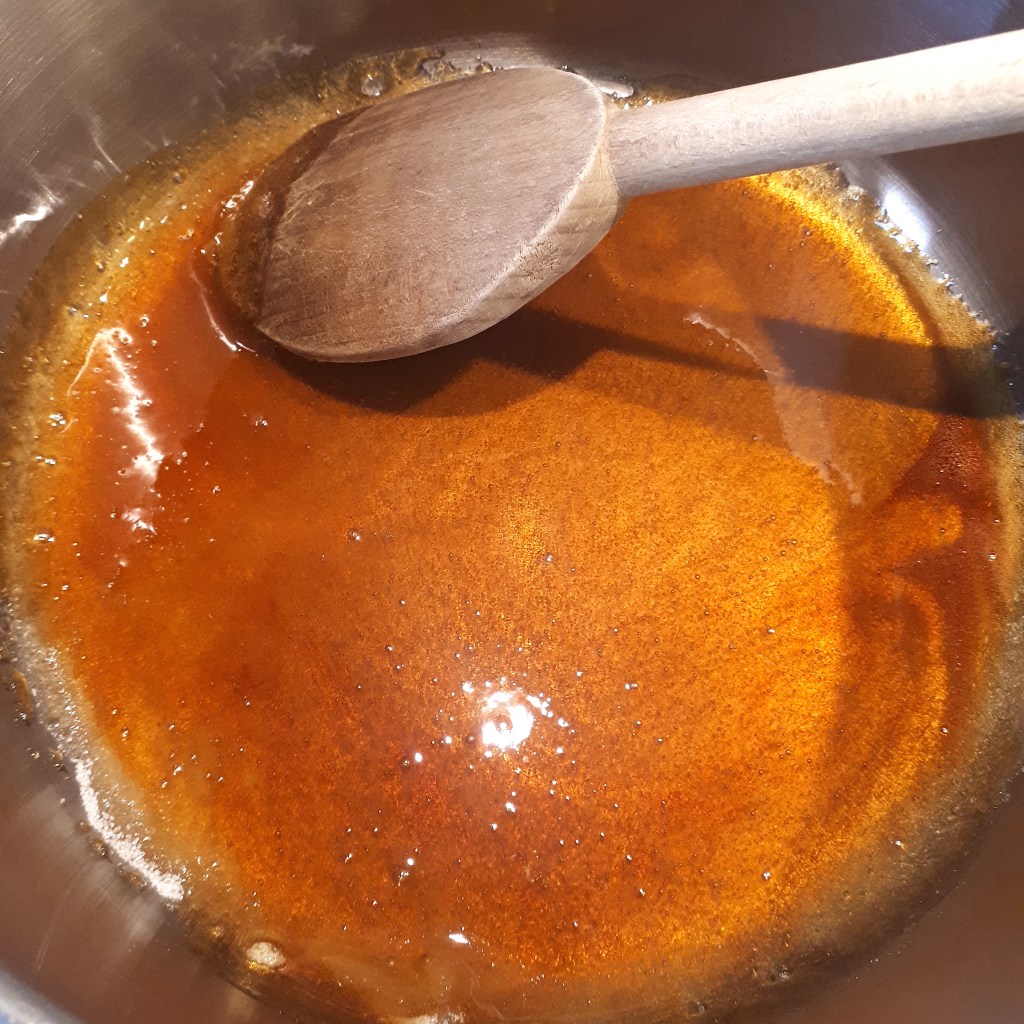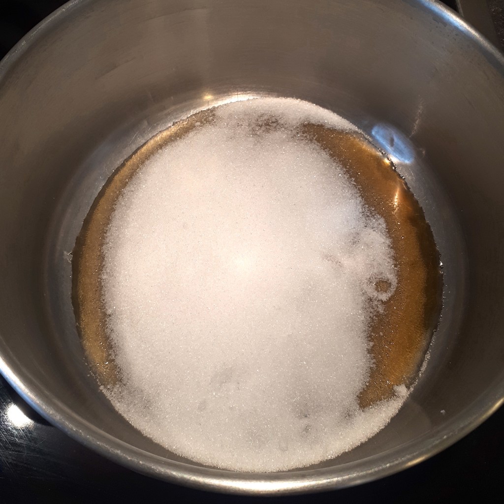 2.Dans une casserole faire cuire le sucre avec 1 CàS. d’eau sans remuer jusqu’à obtenir un caramel blond.
