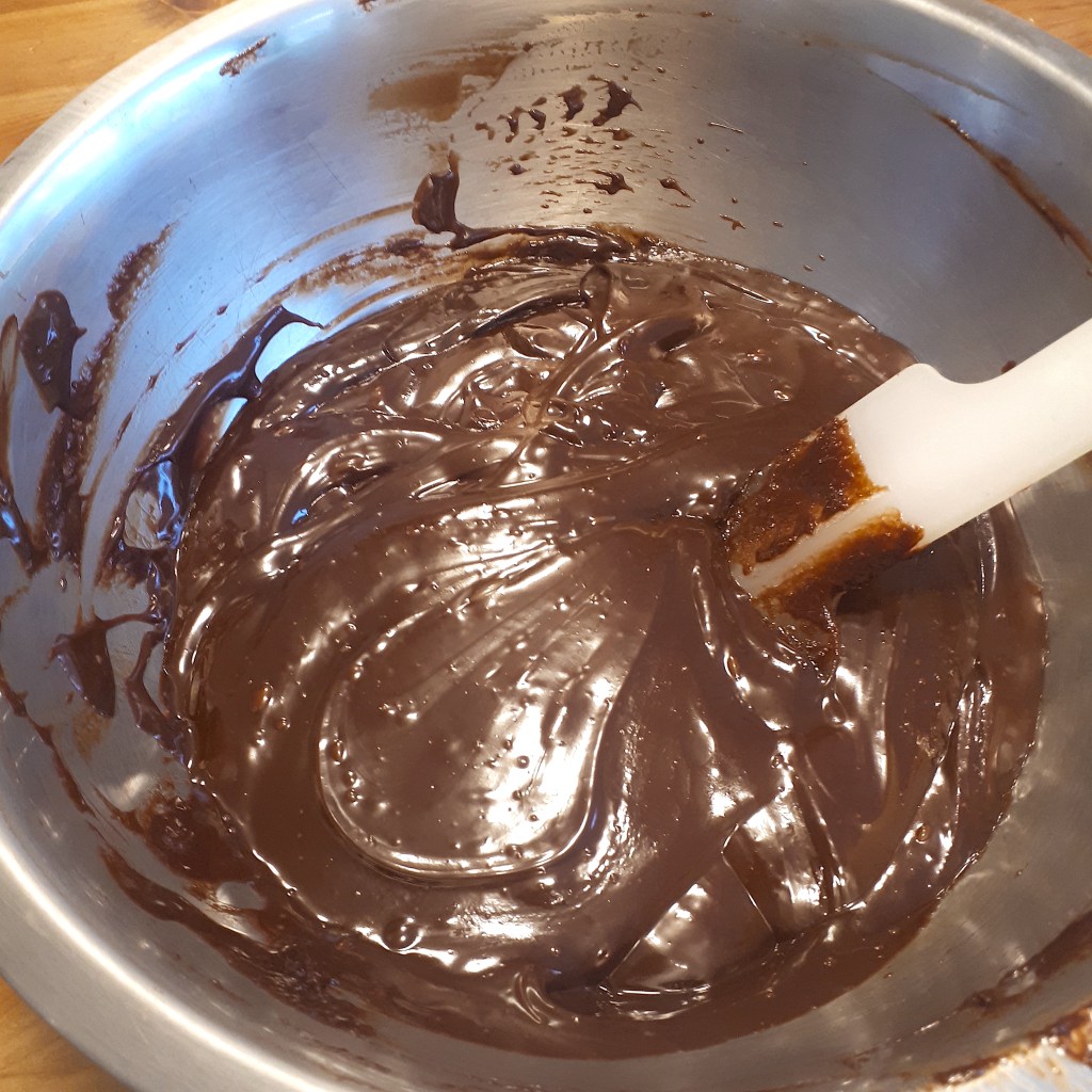 5.Bien mélanger, incorporer le beurre demi-sel puis verser sur le chocolat fondu.