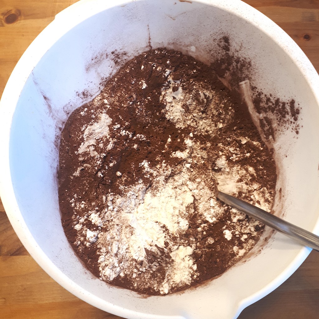4.Ajouter le mélange farine-cacao et la pointe de sel.