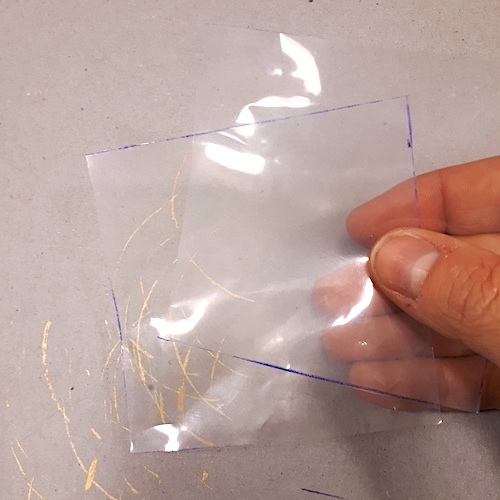 5.Dans une des feuilles de plastique, découper deux carrés identiques. La dimension dépend de celle de votre cercle. Le carré doit dépasser de 1 à 1,5 cm de chaque côté du cercle.