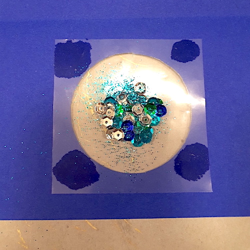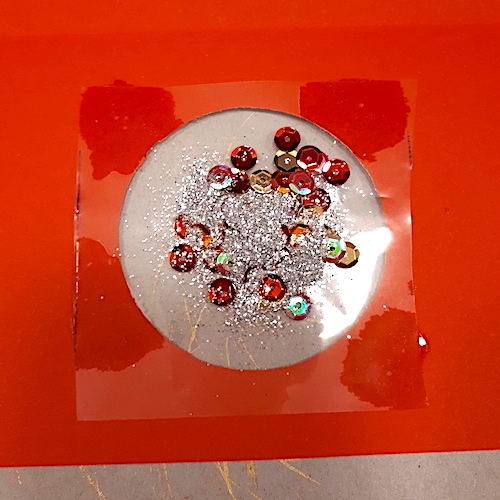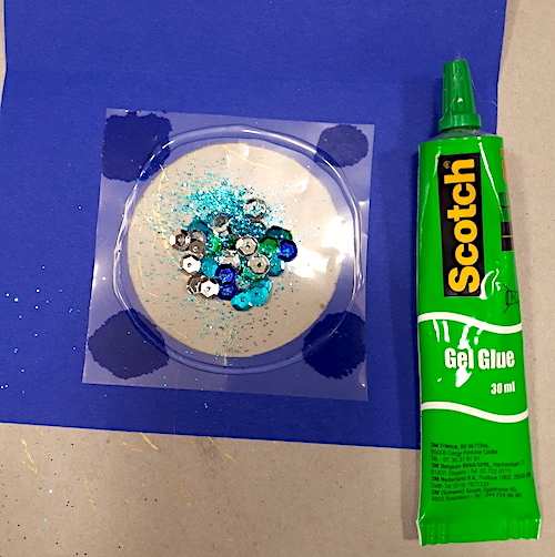 8.Faire un cercle de colle tout autour avant de positionner le deuxième carré de plastique sur le premier. Attention à laisser la carte bien à plat pendant cette étape pour éviter que les paillettes ne se mêlent à la colle.