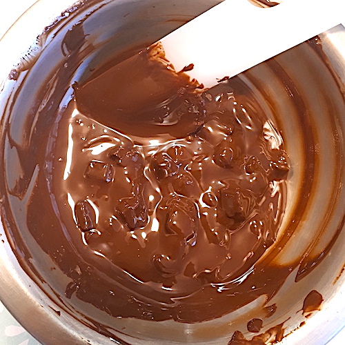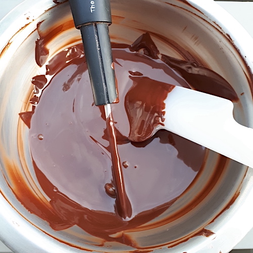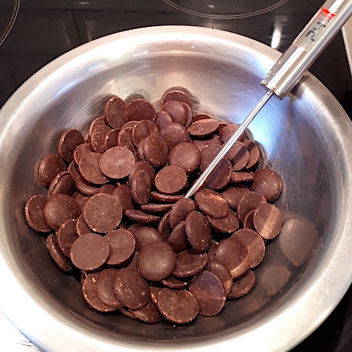 2.On tempère du chocolat (si vous achetez du chocolat de couverture en callets, la courbe de température est normalement indiquée sur le côté du paquet). Vous pouvez choisir le chocolat de votre choix (noir, lait, etc.).