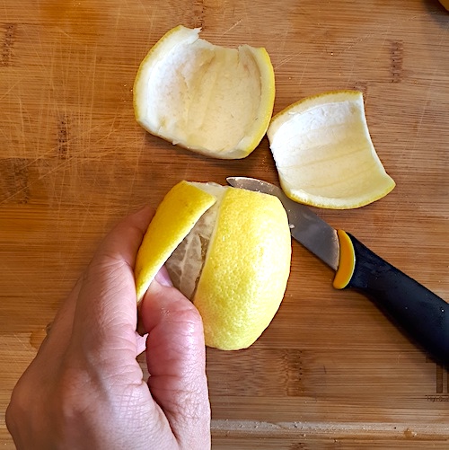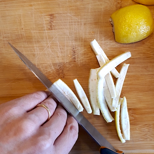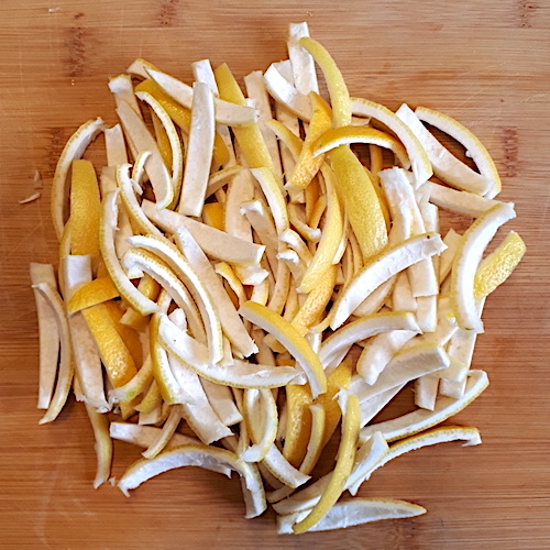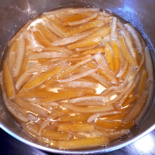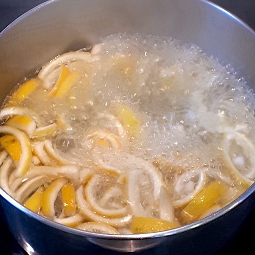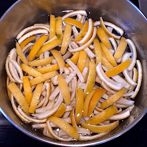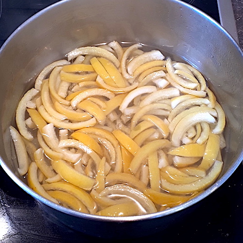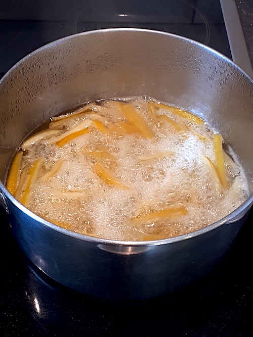 4.Égoutter et répéter le point 3. encore deux ou trois fois. Blanchir les écorces permet d’en ôter l’amertume.