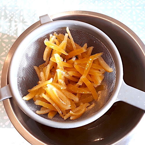 8.Égoutter les écorces au-dessus d’un bol afin d’en récupérer le sirop.