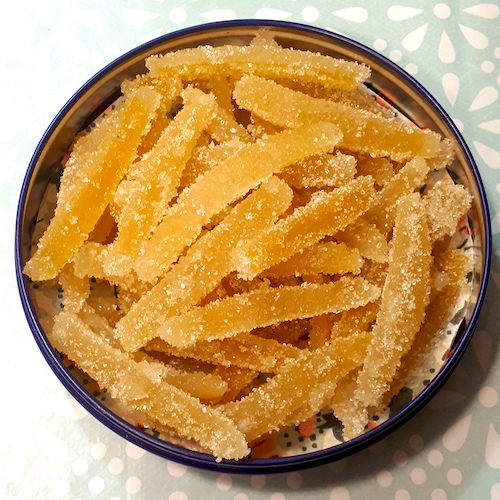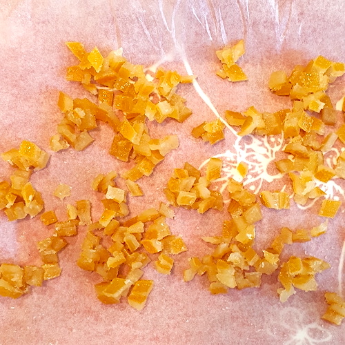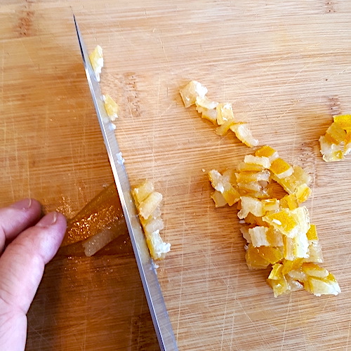 1.On taille grossièrement les écorces confites en petits morceaux.