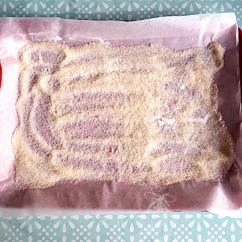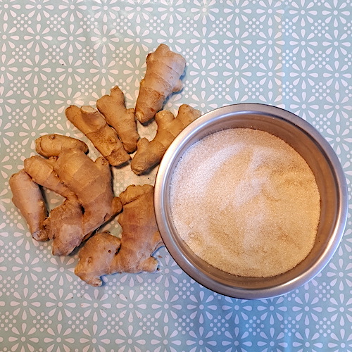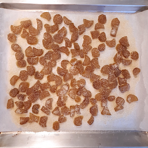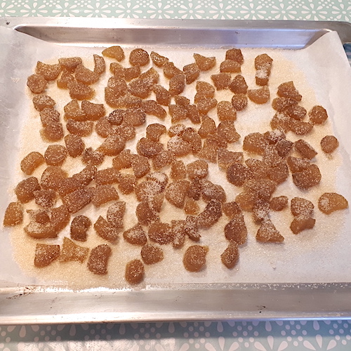 15.Répartir les morceaux de gingembre sur la plaque et saupoudrer de sucre.