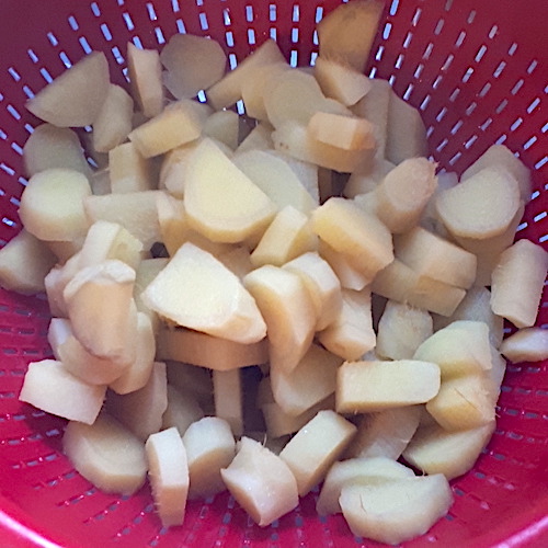 5.Mettre le gingembre dans une casserole remplie d’eau, porter à ébullition pendant environ 5 minutes puis égoutter.